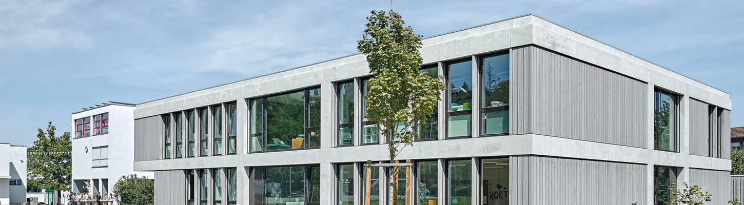 Neubau eines Schulgebäudes mit Schul- und Hortzimmern, Gastroküche, Personenaufzug, WC-Anlagen sowie Lager- und Aufenthaltsräumen. Der Minergie-zertifizierte Erweiterungsneubau wurde in konventioneller Massivbauweise errichtet. Die Wände und Treppenhäuser der öffentlichen Bereiche sind in Sichtbeton ausgeführt. Die Fassade besteht aus vorgefertigten Sichtbetonelementen in Kombination mit vorvergrautem Zedernholz. Die Gründung erfolgte mittels Druckpfählen und einer bewehrten Stahlbetonplatte.